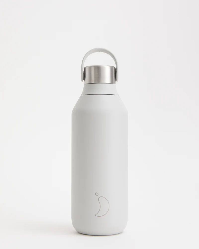 Botella reutilizable de acero inoxidable en color blanco con asa integrada. Diseño elegante, resistente y perfecta para uso diario y personalización corporativa.